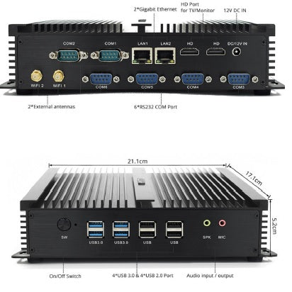 Fanless Mini PC, Procesador Intel i7 4600U, 3.3GHz, con 8G DDR3L RAM, 256G SSD y 2TB HDD. 2 HDMI, 2 LAN Gb RJ45, WiFi y Bluetooth, 4 puertos USB 3.0, 3 puertos USB 2.0. 6 puertos RS-232, Puerto Audio In/Out. Fuente externa 12V/5A incluida. No incluye SO.