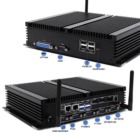 Fanless Mini PC, Procesador Intel i7 8550U, 3.3GHz, con 8G DDR3L RAM, 256G SSD y 4TB HDD. HDMI, DP y EDP, 2 LAN Gb RJ45, WiFi y Bluetooth, 4 puertos USB 3.0, 4 puertos USB 2.0. 6 puertos RS-232, Puerto Audio In/Out. Fuente externa 12V/6A incluida. Compatible con Win11. No incluye SO.