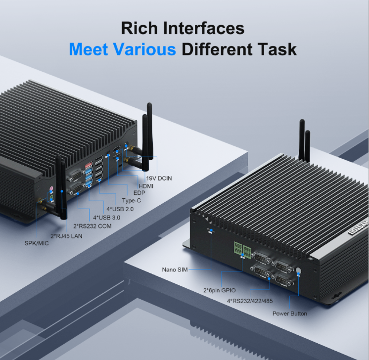 Fanless Mini PC, Procesador Intel i5 10310U, 1.6 a 4.2GHz, con 16G DDR4 RAM, 256G SSD y 4TB HDD. HDMI, DP y USB-C, 2xLAN Gb RJ45, WiFi, 4xUSB 3.0, 4xUSB 2.0. 2xRS-232 4xRS-485/RS-422, Puerto Audio In/Out. Gabinete aluminio con soporte aletas de soporte a muro. Fuente externa 19V/5A incluida. Compatible con Win11. No incluye SO. Reemplaza a H4-i7-8550U.