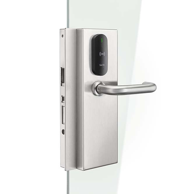 XS4 Original+ Glass Door Escutcheon - DIN. Electronic Escutcheon, Glass door DIN 18101, 2 handles any type. Includes automatic deadbolt projection mortise lock and strike plate for framed doors. Technology: Mifare + Bluetooth LE + HSE - standard square spindle, finishes and handles.