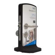 SALTO XS4 Electronic Escutcheon Ex650, 2 Handles, any type. Technology: Mifare + Bluetooth LE + HSE - 8 mm square spindle, finishes and handles. Demo block with natural wood finish cover.