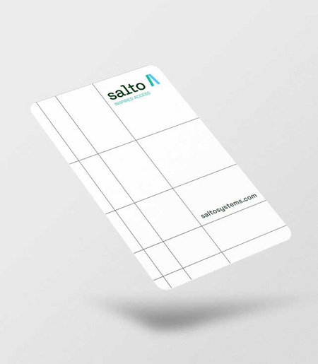 SALTO keycard , PVC material with NXP Mifare DESFire 2K technology and compatible with SALTO Space platform. Pack of 50 units. SALTO Standard Design White + one side Blank.